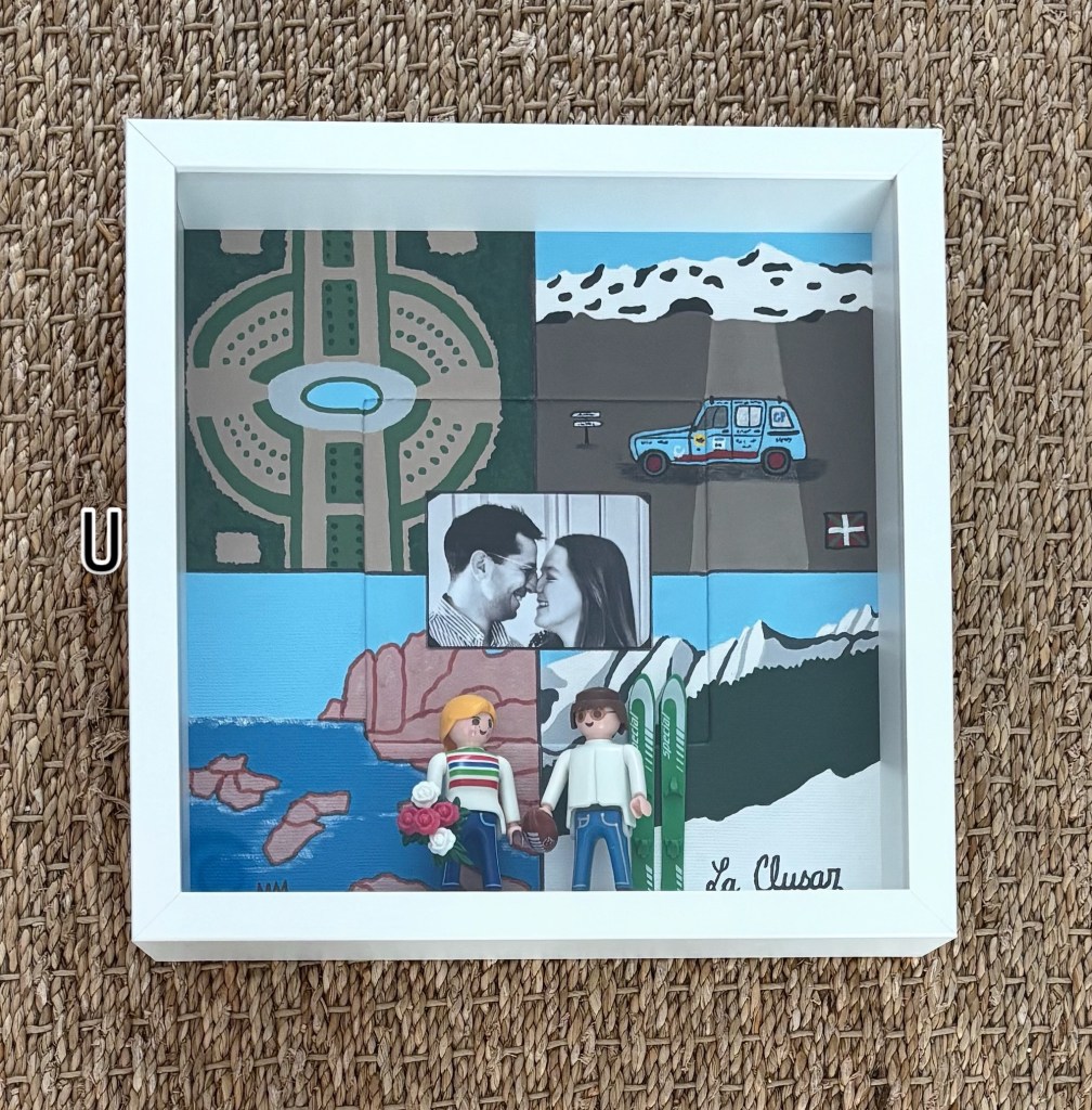 Un cahier des charges très rempli : du Maroc en passant par les Alpes, la Bretagne, Paris, la photo des mariés, quelques objets ….😅. Allier la peinture et les playmobil permet beaucoup de choses !!#cadeaudemariage #cadeaudemariagepersonnalisé #playmo #playmobils #playmobil #enavantleshistoires #fandeplaymobil #peintureacrylique #acrylpainting