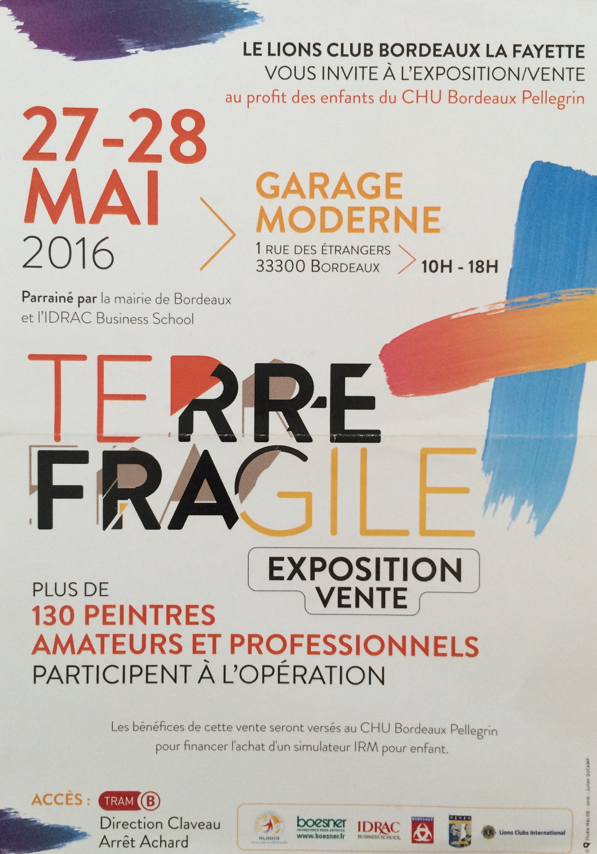 Nous sommes 160 à participer à cette expo vente. Nous avons tous offert une œuvre. Elles seront vendues au profit du CHU BORDEAUX PELLEGRIN afin de financer l’achat d’un simulateur IRM pour enfant.Venez nombreux et soyez généreux !!