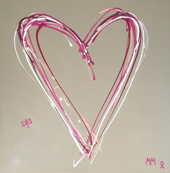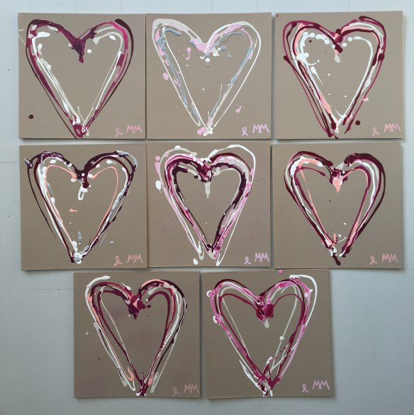 Série de petites toiles cœurs roses entrelacés pour l’asso « Au sein des femmes » dans le cadre d’octobre rose. Quant à la grande toile, elle a servi à l’élaboration d’une écharpe en collaboration avec Anna.