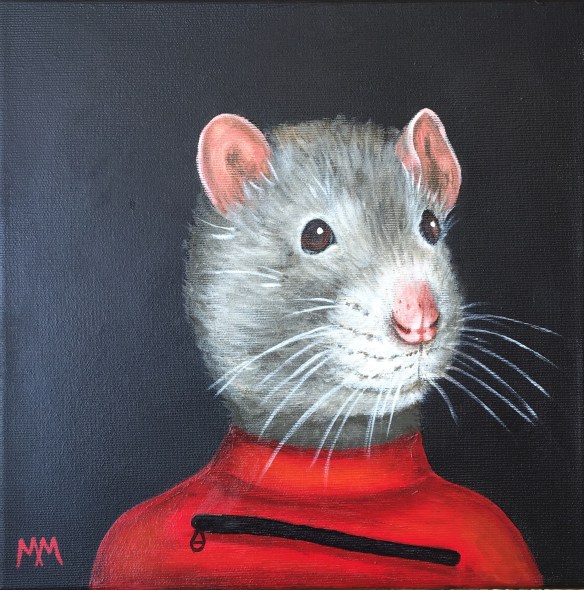 Ma famille d’animaux s’agrandit !! Ici 2 petits formats (30 sur 30) pour un rat en combi de surf et un poussin en col roulé.