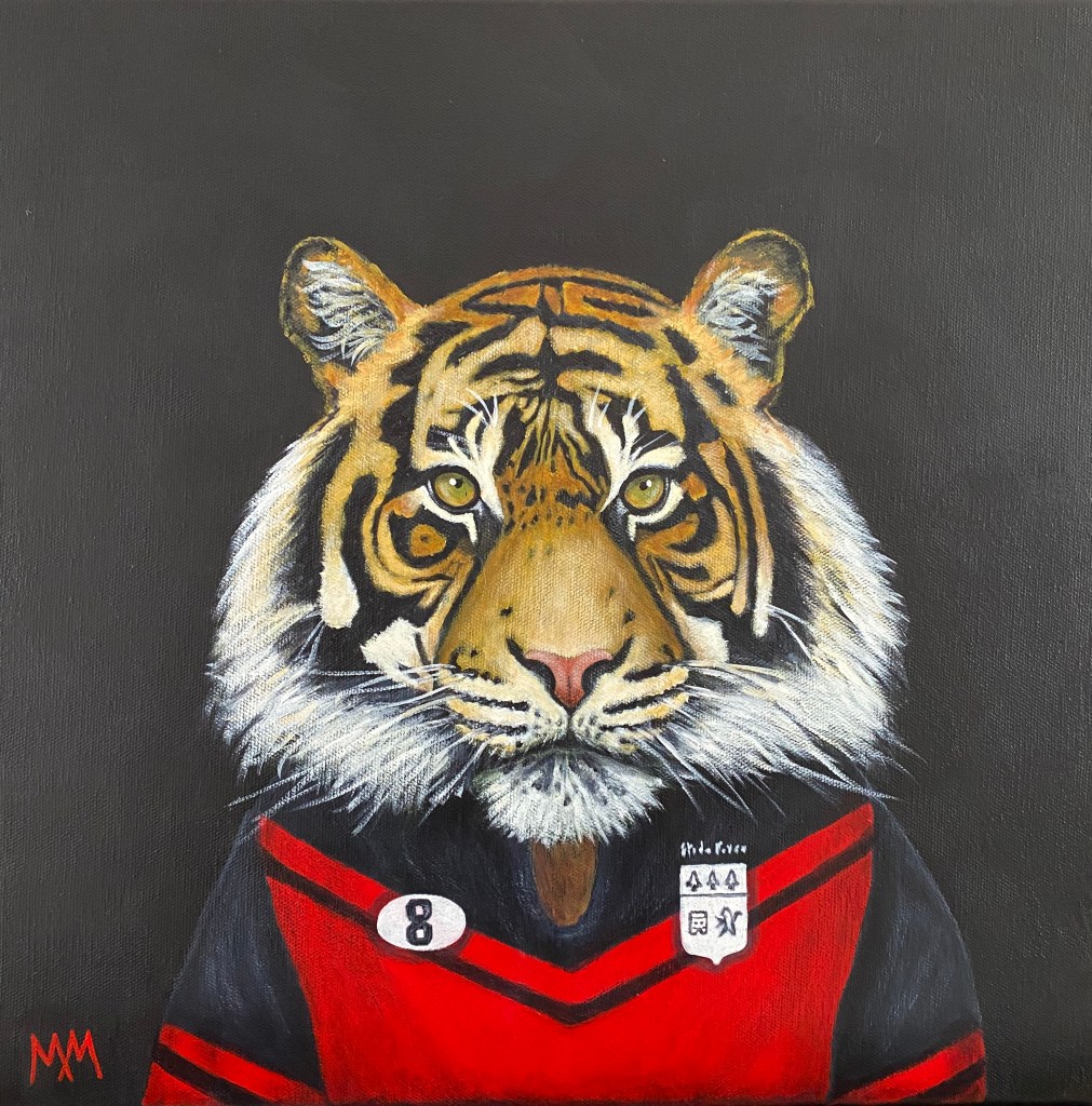 Voilà « Confinement 5 »!! Le mini tigre en maillot de rugby ! Les yeux de félin sont très intéressants à peindre !!