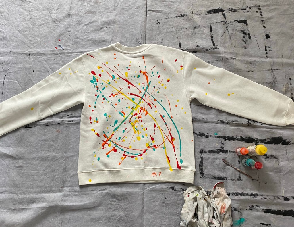 Travail en cours ! Personnalisation d’un sweat tout simple qui devient unique !#oeuvreunique#oeuvrenumerotee #customisation #personnalisation #peinturesurvetement #projections#cadeaupersonnalisé #cadeaunoël