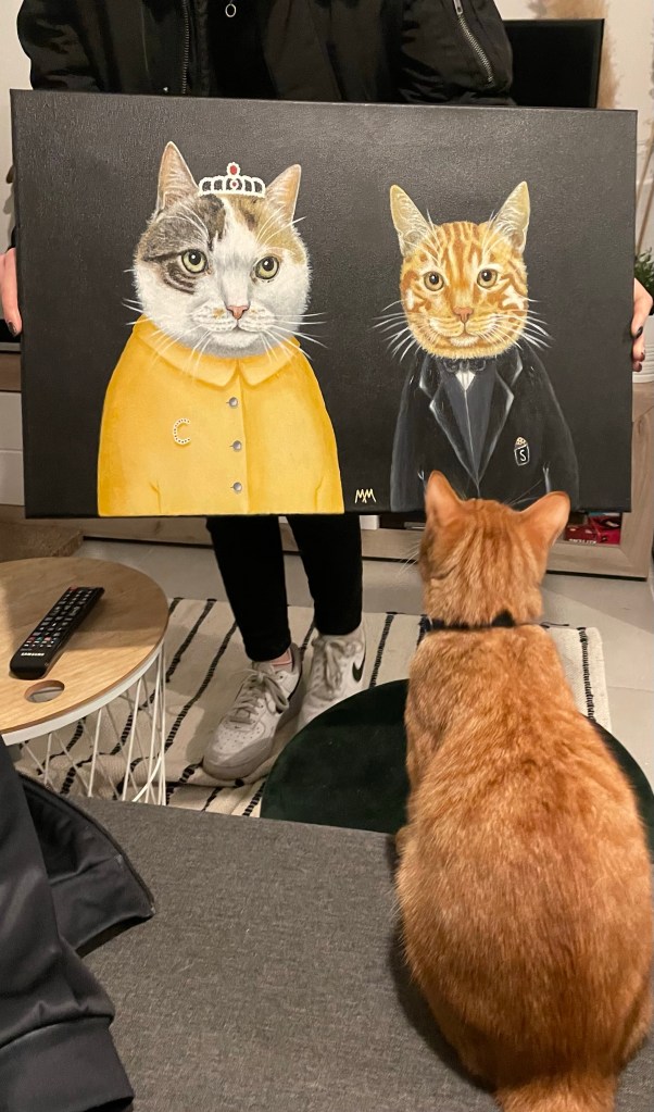 Snickers est content de son portrait et de celui de son amie Cannelle !!!!😂😂🐈🐈⬛##chat#portraitdechat #chathabillé #animauxhabillés #anthropomorphic #peintureanimaliere #acylicpainting